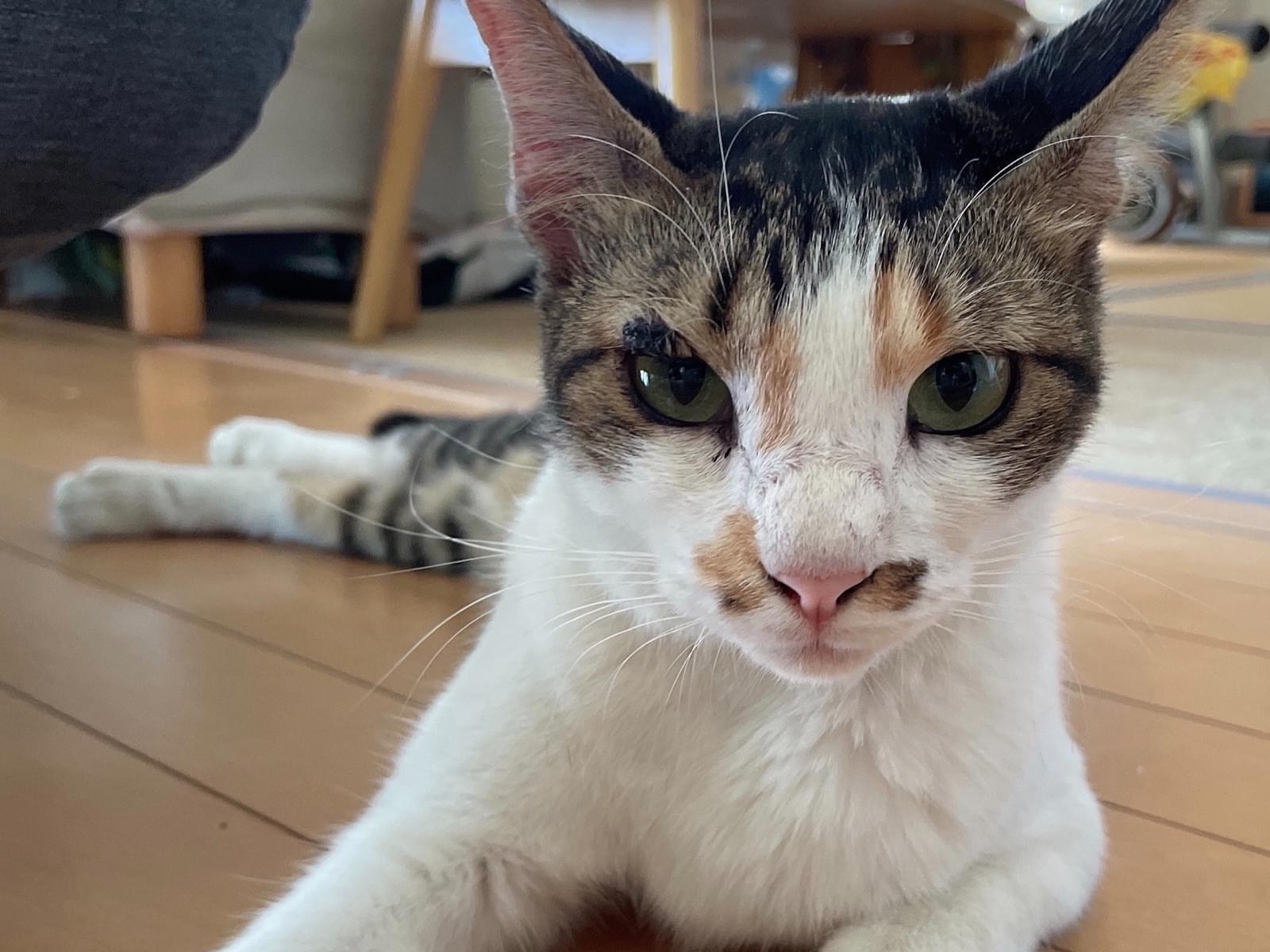 右目の上にかさぶたがあります。痩せていて、とても人懐っこいです。耳が大きく、ヒゲも長く、小顔です。鳴き方が特徴的です。道端でニャーニャー鳴いていたので、餌を与えたところ家まで着いてきてしまいました。首輪はしていません。