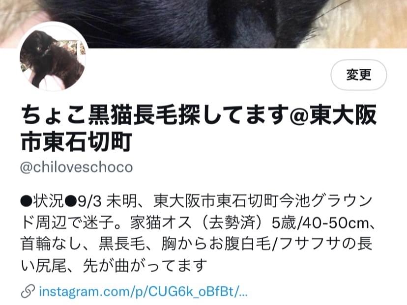 ちょこ、東大阪市東石切町5-1 石切大仏,今池グラウンド周辺で迷子。オス去勢済み、5歳、40-50cm、首輪なし、黒毛,やや長毛、胸のところに白っぽい毛(月輪熊みたいな)があります。フサフサの尻尾雨に濡れて萎んでいるかもしれません。窓を自分で開けて、出ていってしまいました。窓が高く戻れず、外を知らないので、外からおうちがわからないのかもと、心配で仕方なく、毎日泣いています。助けてください。見かけたら教えてください。※少し小さい時の写真も載せておきます。