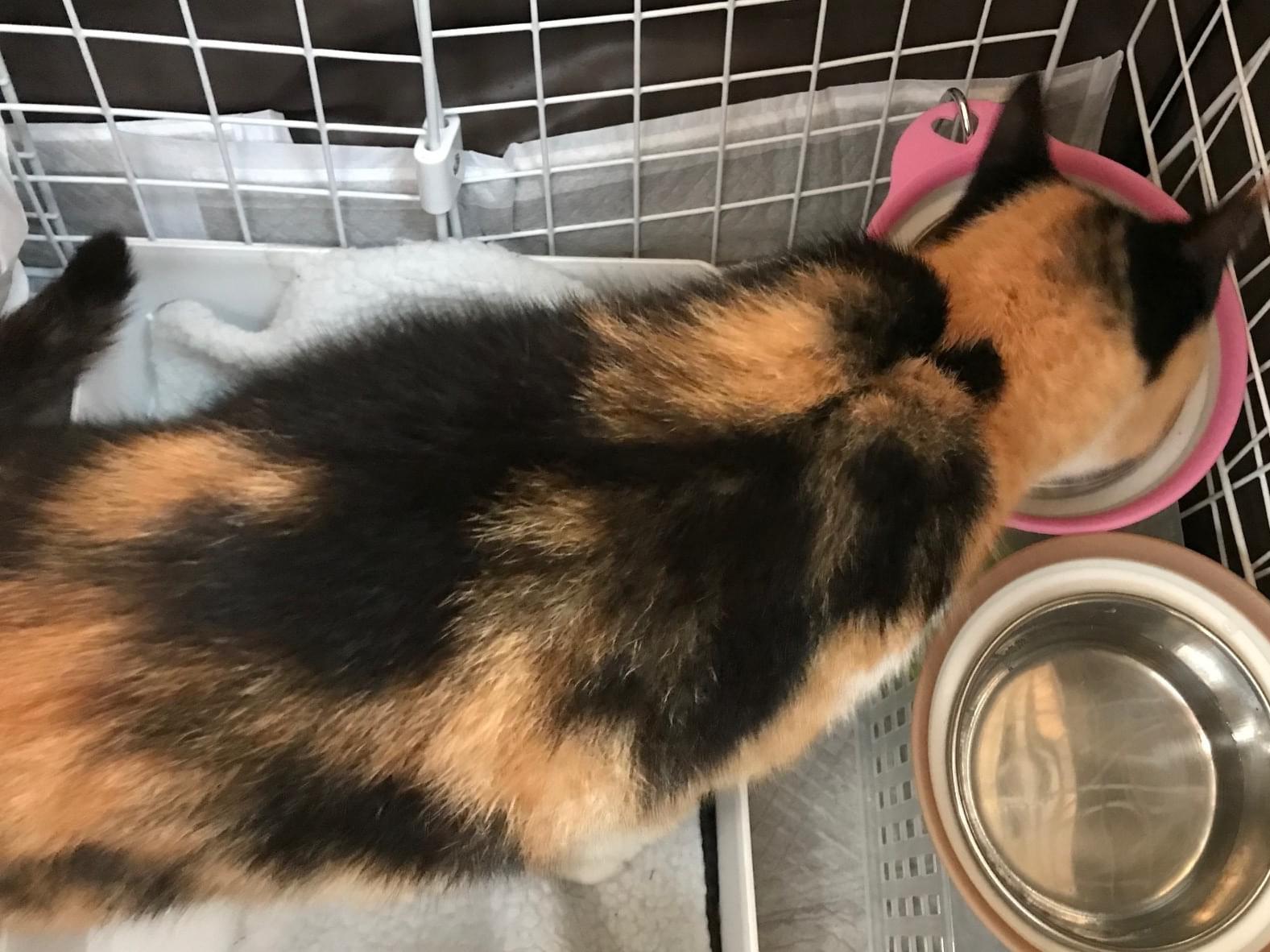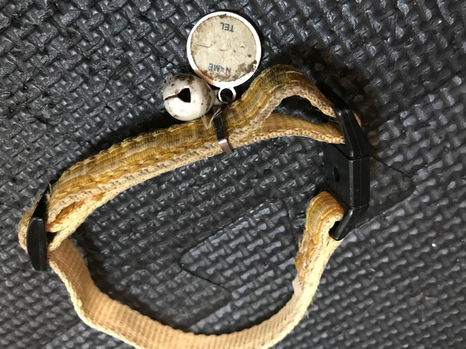 黄色い首輪をした三毛猫、とても人懐こい猫を保護しています